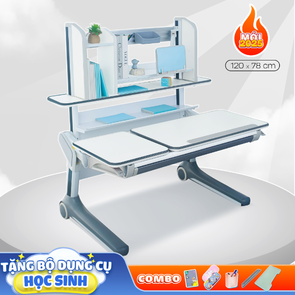 Mặt bàn nghiêng hỗ trợ viết, đọc, vẽ, trong khi mặt bàn cố định đựng sách vở và dụng cụ học tập. Đặc biệt, mặt bàn dày 25mm,