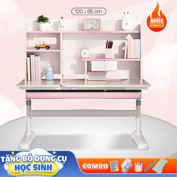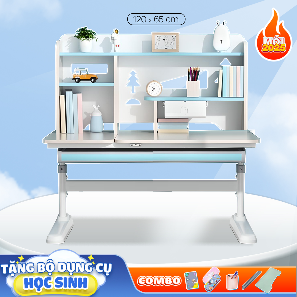 Kệ sách và ngăn chứa đồ rộng rãi, kệ sách thiết kế độc đáo mới lạ và chắc chắn, bé thoải mái học online, có giá đỡ điện thoại và có khoang chứa các thiết bị điện tử.