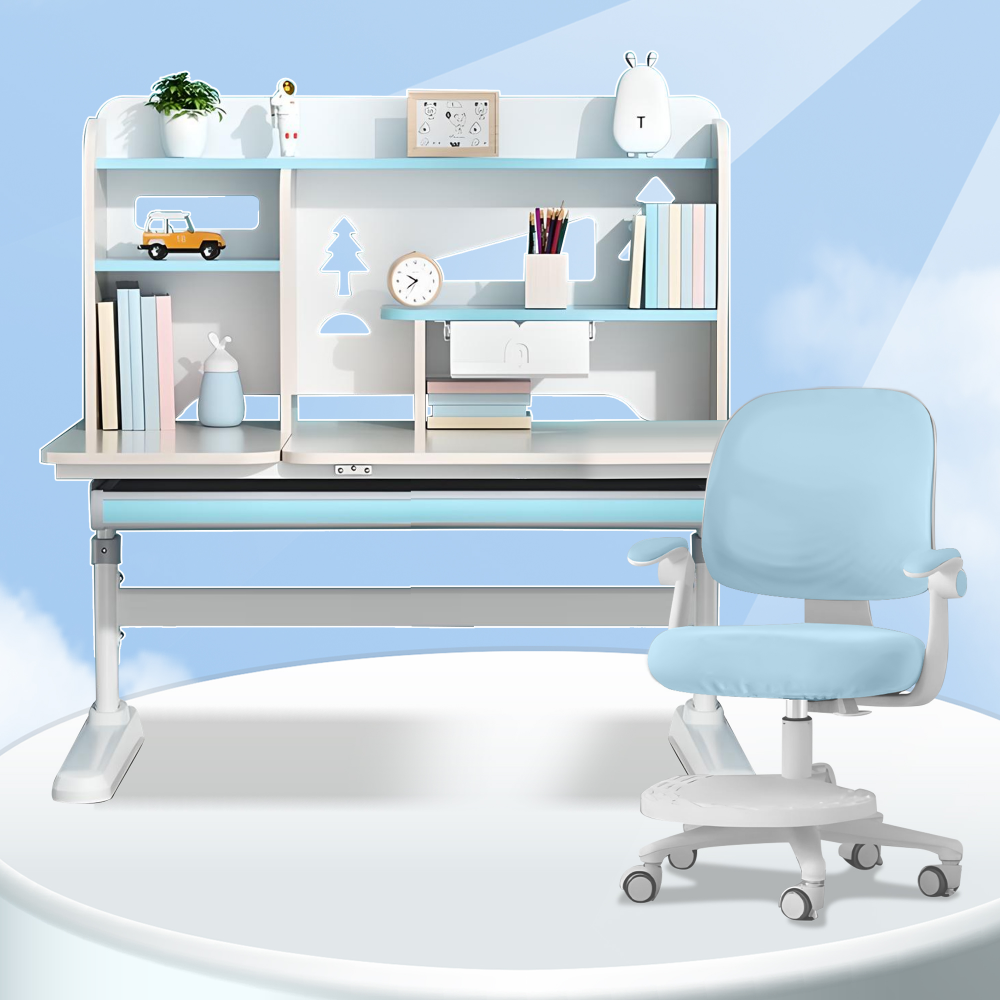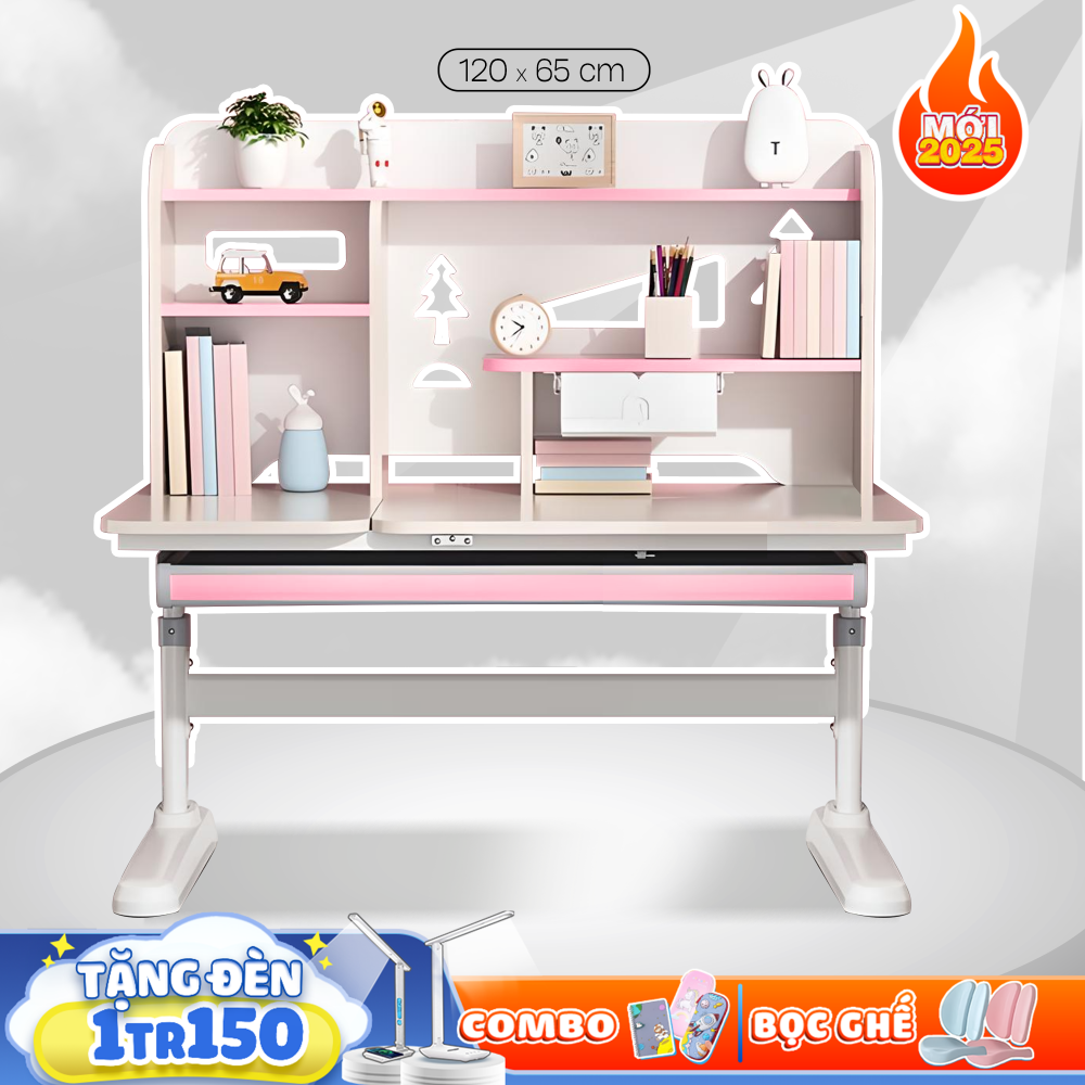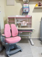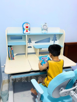 Kệ sách và ngăn chứa đồ rộng rãi, kệ sách thiết kế độc đáo mới lạ và chắc chắn, bé thoải mái học online, có giá đỡ điện thoại và có khoang chứa các thiết bị điện tử.