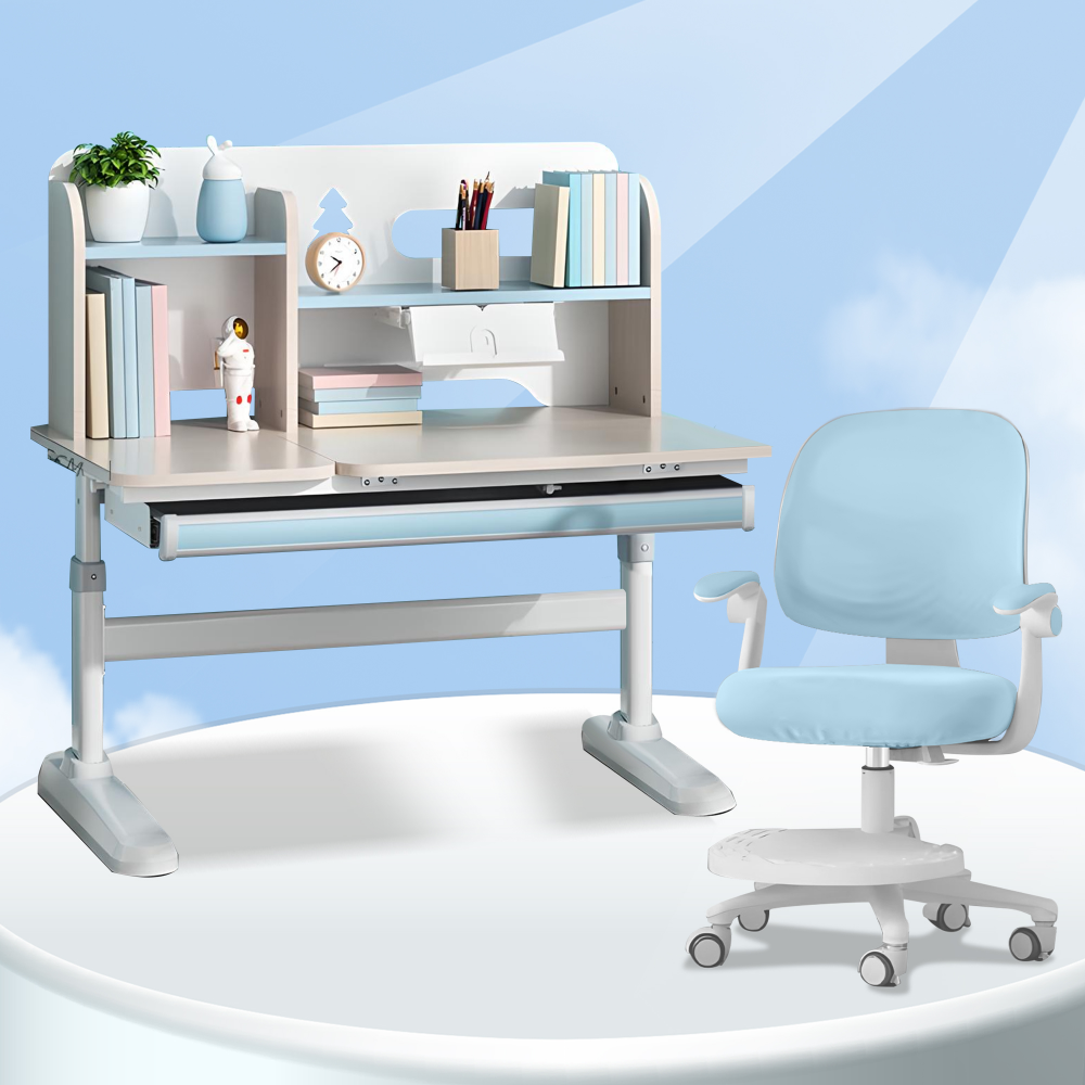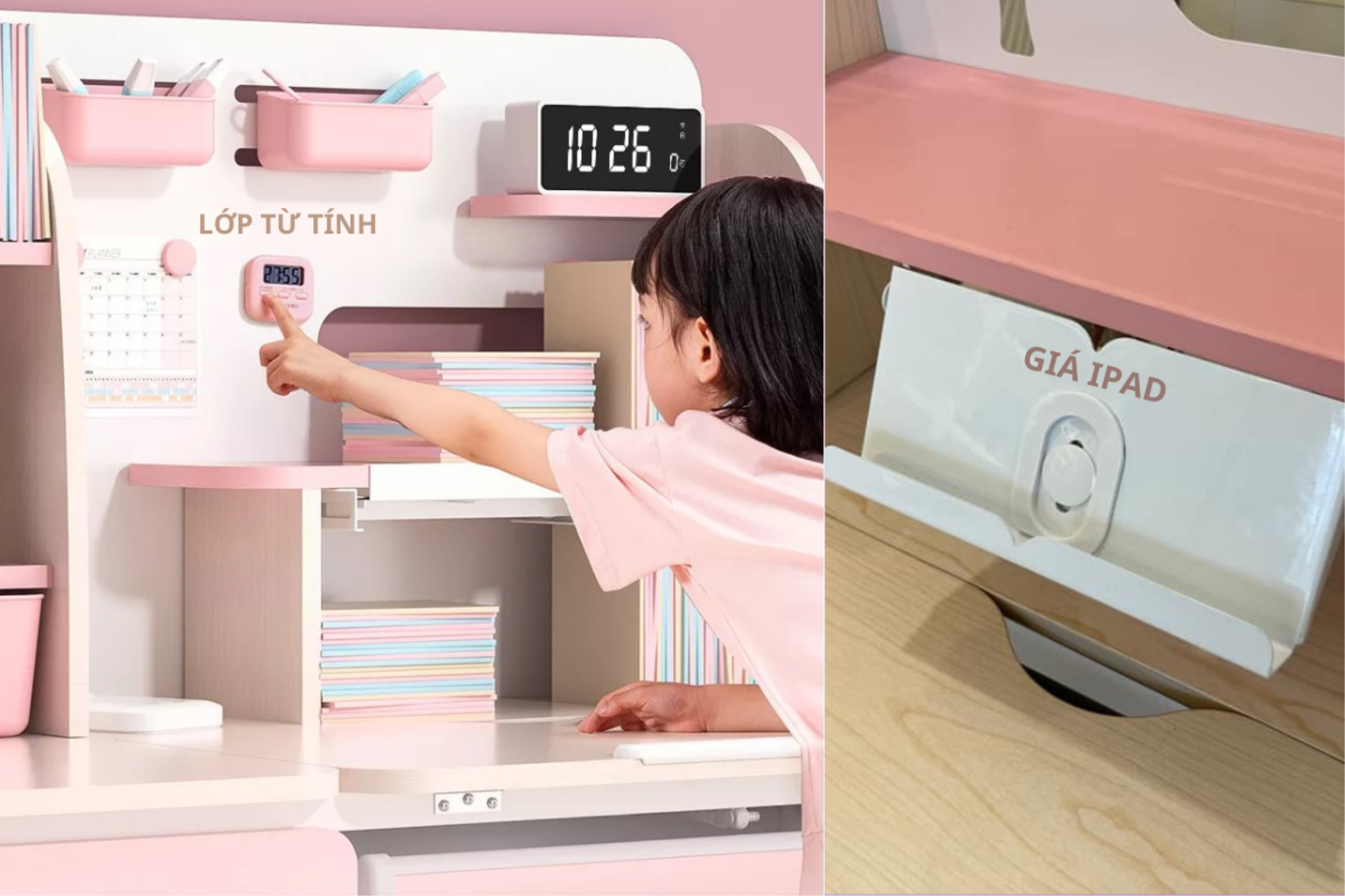 Kệ sách và ngăn chứa đồ rộng rãi, kệ sách thiết kế độc đáo mới lạ và chắc chắn, bé thoải mái học online, có giá đỡ điện thoại và có khoang chứa các thiết bị điện tử.