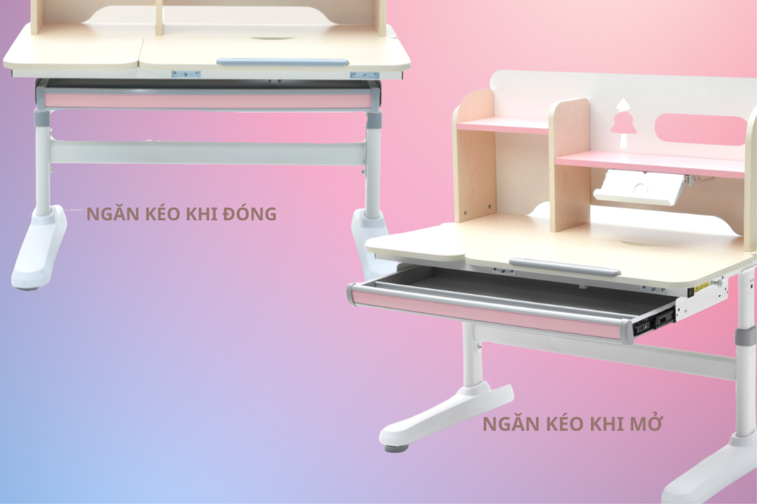 Ngăn kéo ẩn giúp tăng không gian để chân cho người ngồi cạnh bé. Điều này rất thuận tiện khi người lớn có thể ngồi cạnh trẻ để hướng dẫn trẻ học bài.