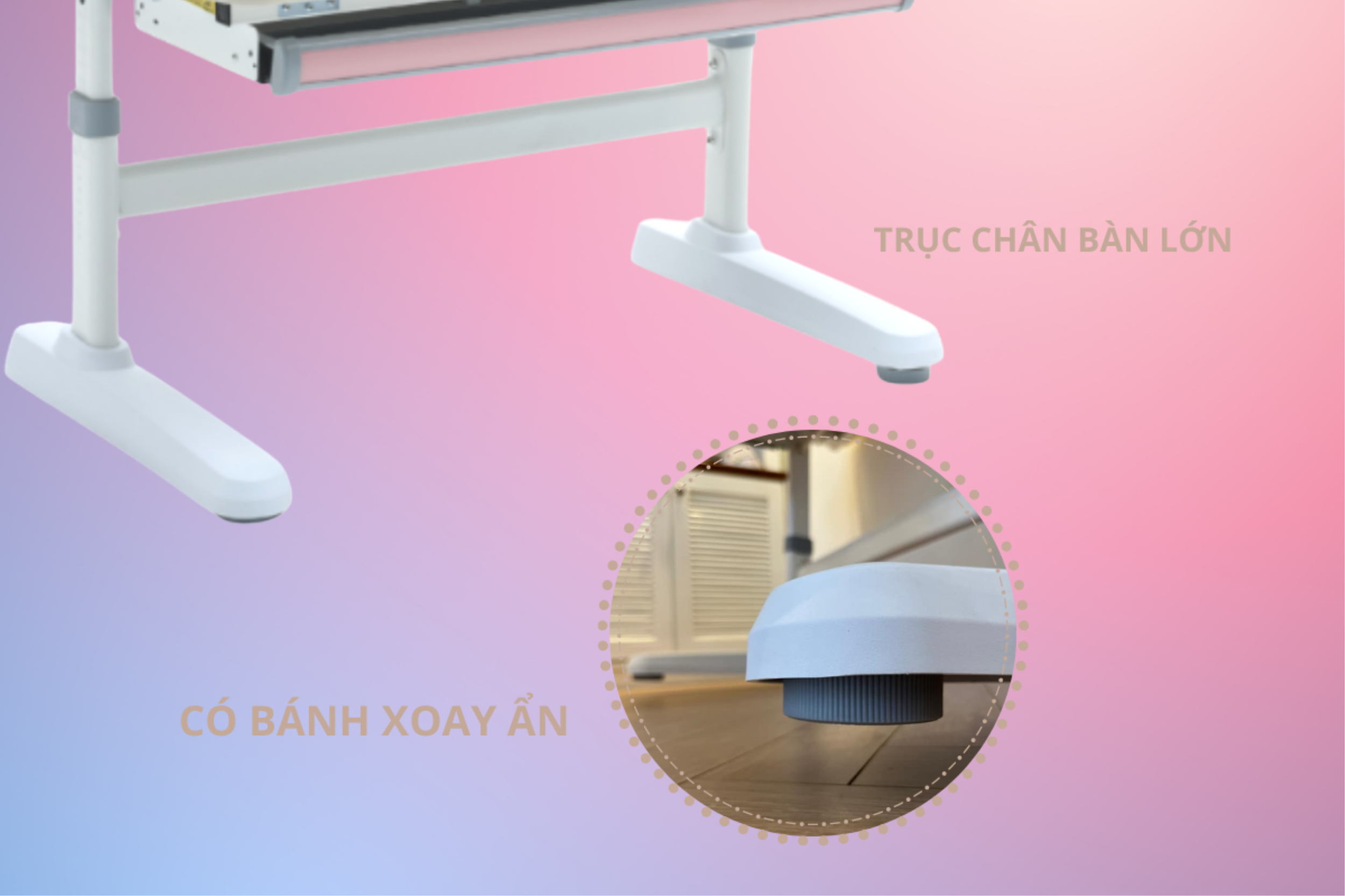 Trục chân bàn lớn, có bánh xoay ẩn giúp di chuyển vị trí bàn dễ dàng. Núm cao su giúp điều chỉnh chân bàn cân bằng, chắc chắn hơn..