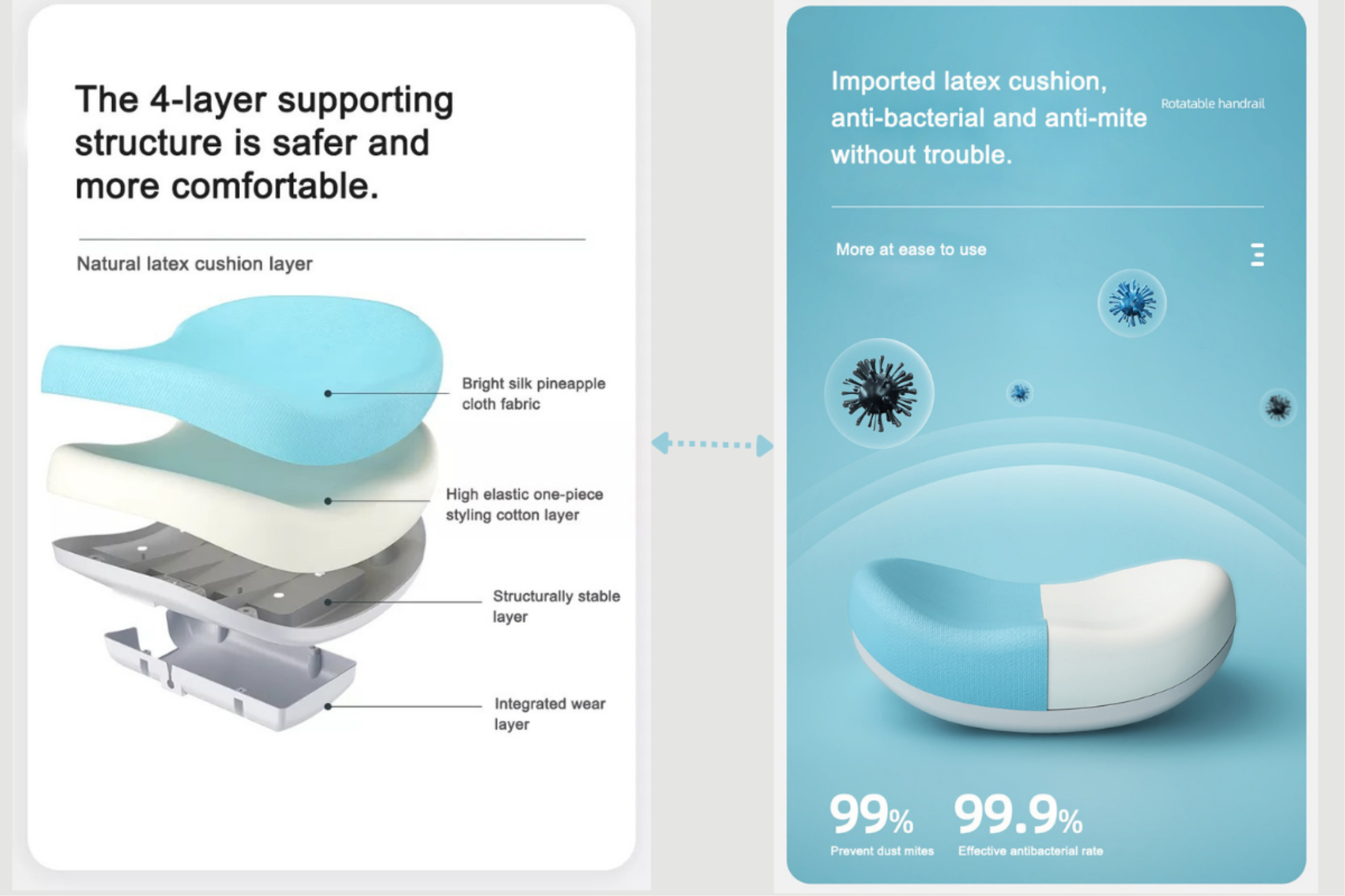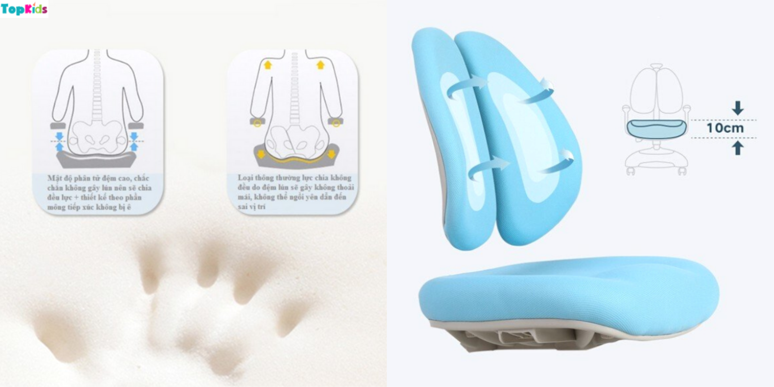 Đệm ghế sử dụng chất liệu foam nguyên khối đậm đặc đàn hồi, thiết kế tạo hình cong theo phần mông người ngồi. Các lực tác động được phân chia đồng điều lên toàn phần cơ thể, mang lại cho trẻ cảm giác dễ chịu, không bị tê mỏi khi ngồi lâu.