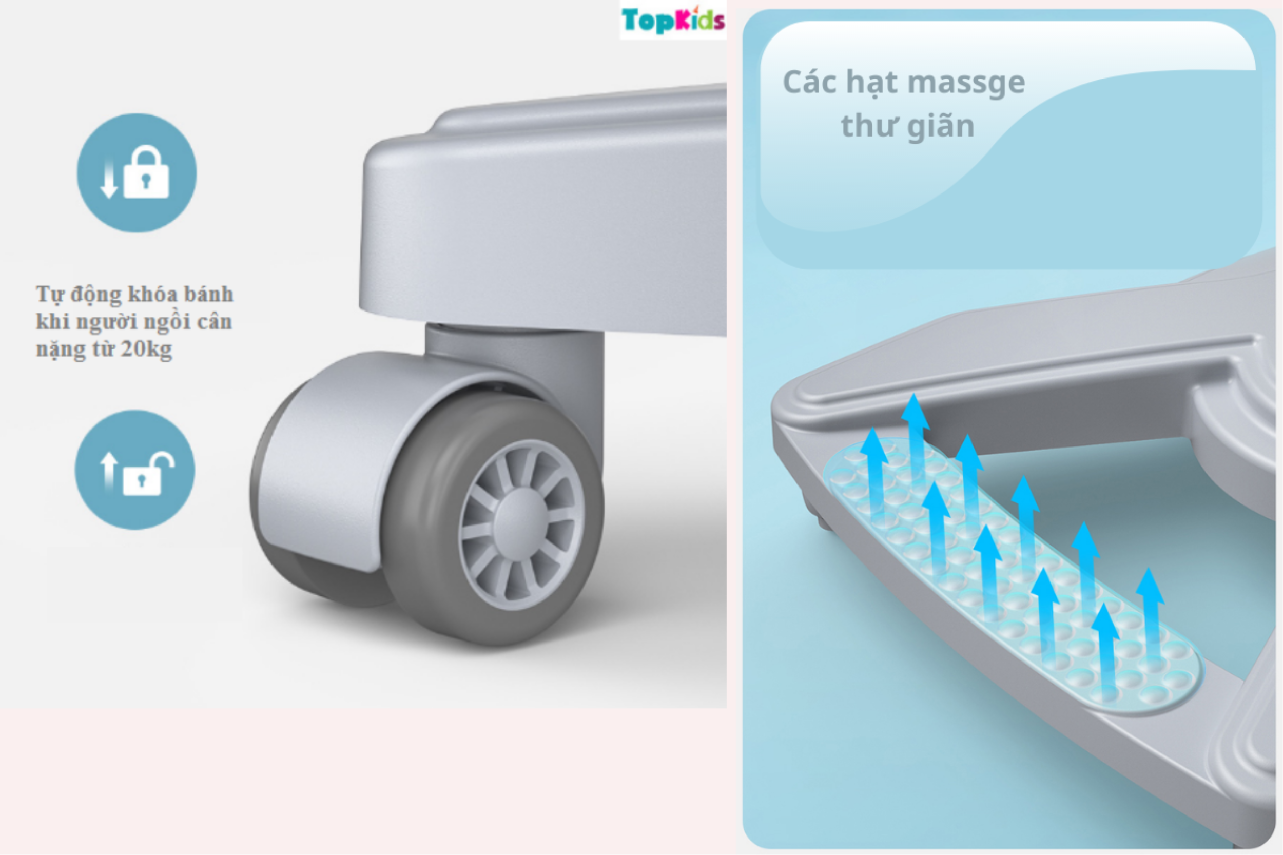 Trục ghế được thay thế bằng hợp kim nhôm ( vật lý sử dụng trong vỏ máy bay). Sử dụng trục ghế không quay, giúp trẻ tập trung hơn vào công việc học tập cũng như không làm cong cột sống ( rất quan trọng với trẻ từ 5 tuổi trở lên khi mới bắt đầu học).