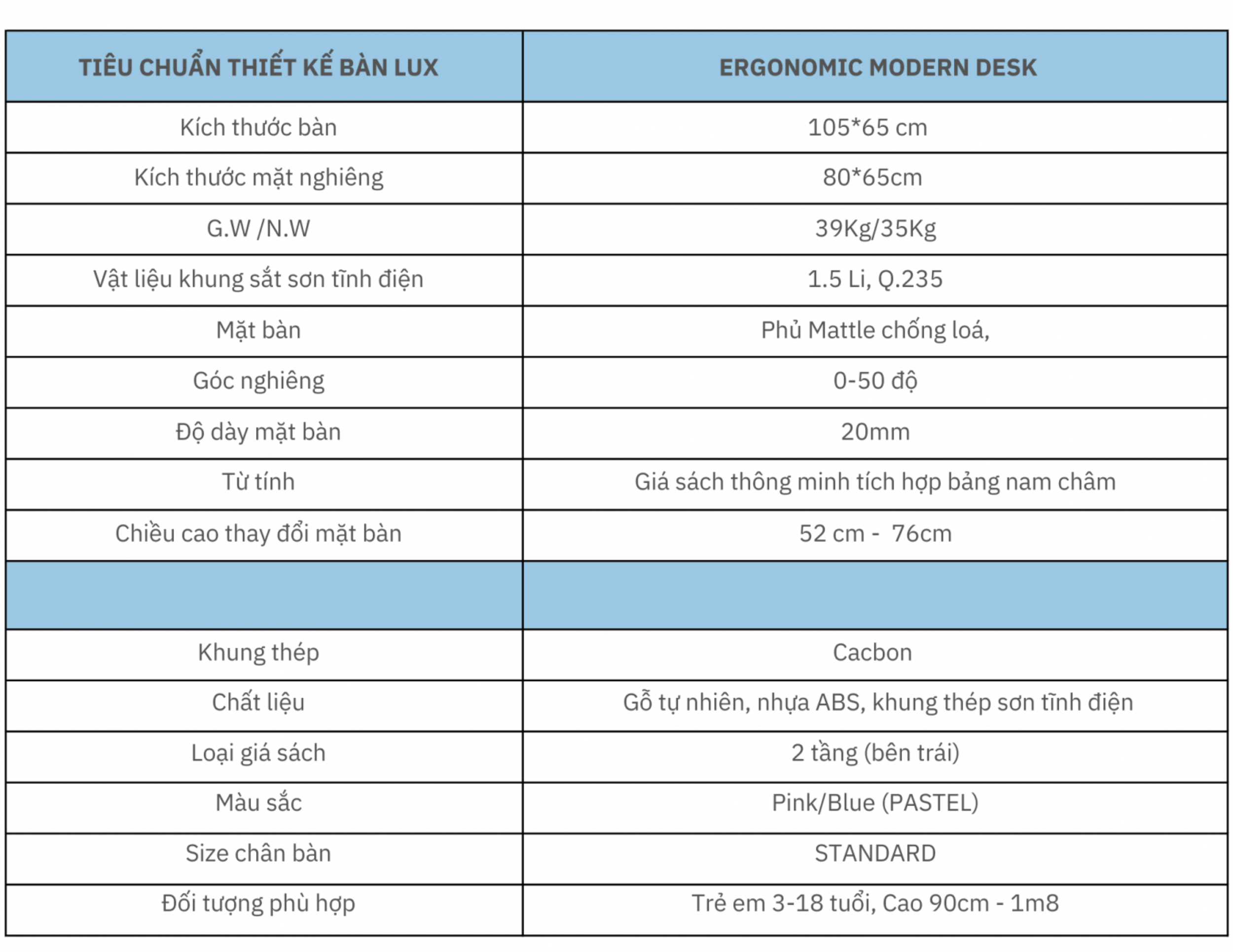 Bàn học chống gù chống cận cho bé, mẫu bàn thông minh A10 LUX G1 là mẫu bàn đạt chất lượng theo tiêu chuẩn Châu Âu. Thiết kế chuẩn Ergonomics được các chuyên gia về Chiropratic và các Physiotherapist hàng đầu tư vấn và chuyên dùng