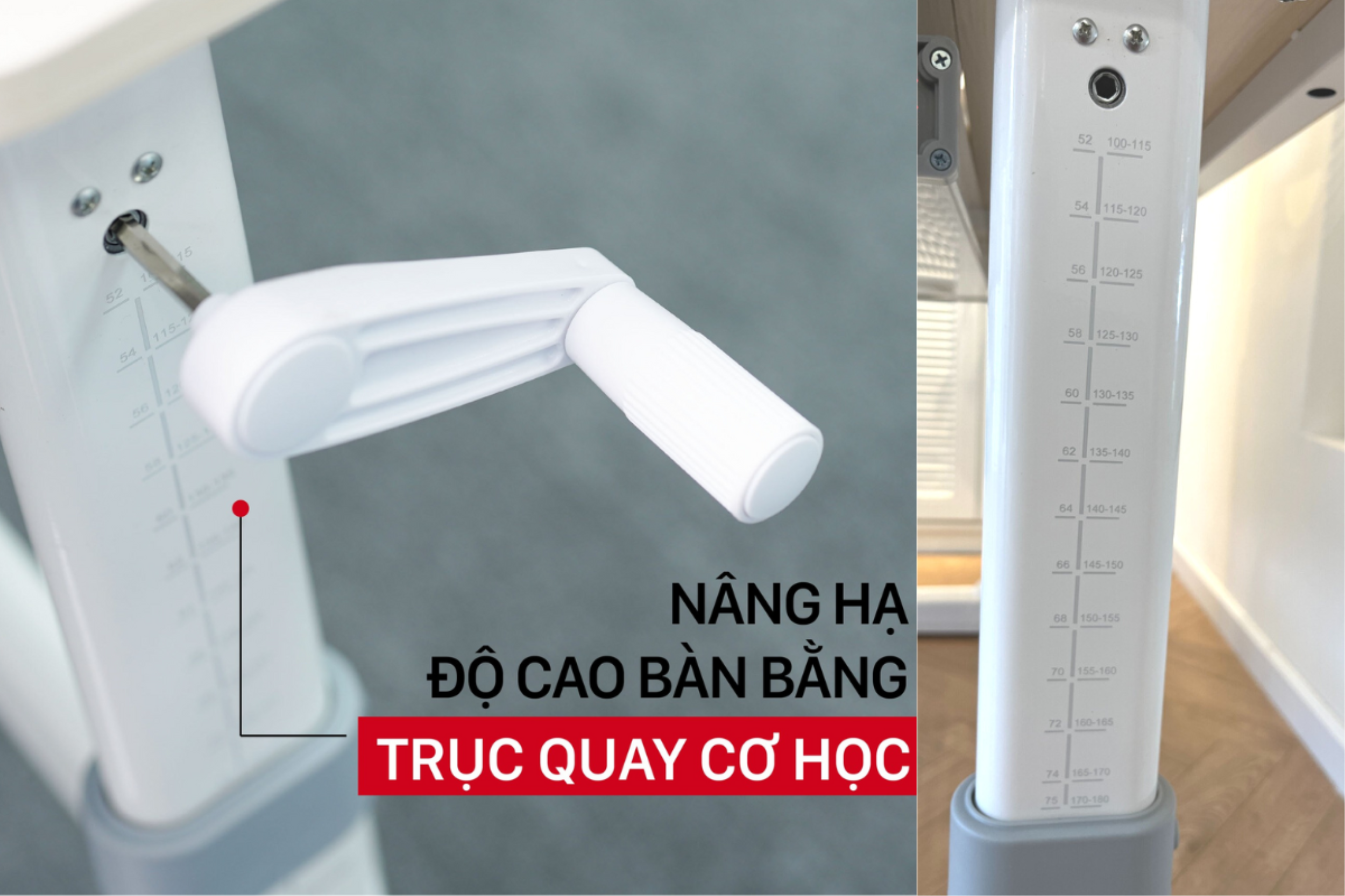 Nâng hạ chiều cao bằng trục quay nâng cao từ 52-76cm, nâng cao khi trẻ lớn chỉ cần nâng cao bàn vừa vặn với bé, 1 lần quay nâng lên cả bàn. Trẻ có thể nâng lên nhẹ nhàng không cần nhờ đến phụ huynh, độ bền cao. Chân bàn gắn tay quay, dễ dàng điều chỉnh nâng hạ chiều cao phù hợp với vóc dáng bé từ 3 tuổi đến trưởng thành.