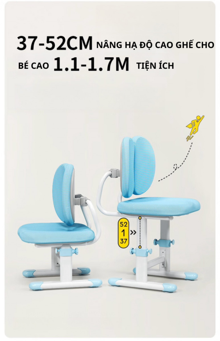 Linh hoạt điều chỉnh độ cao: từ 52cm đến 75cm (tay quay) từ 3 tuổi đến 18 tuổi ( cao trên 1.7m)