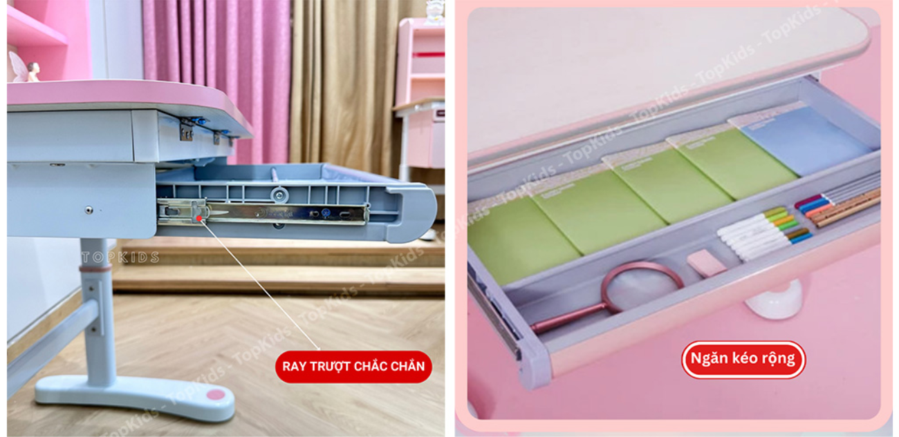 Ray hộc kép: chắn chắn full toàn bàn. Ray rắn chắc. Mặt nhựa ABS 2 lớp.