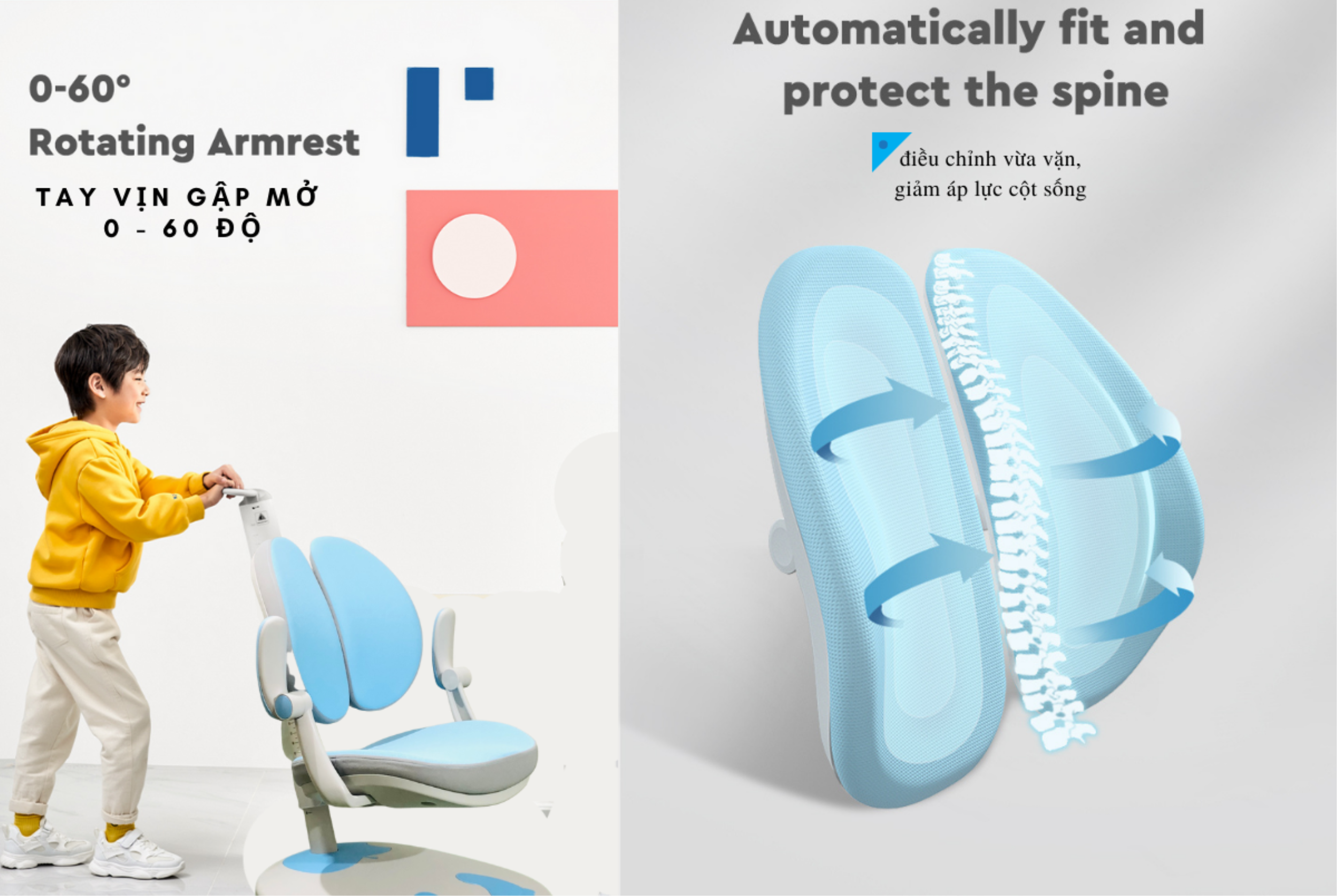 2. Tựa lưng ngoài việc di chuyển lên xuống còn có trục bập bênh ôm lưng khi ngồi giúp con ngồi thẳng lưng mà không bị mỏi.