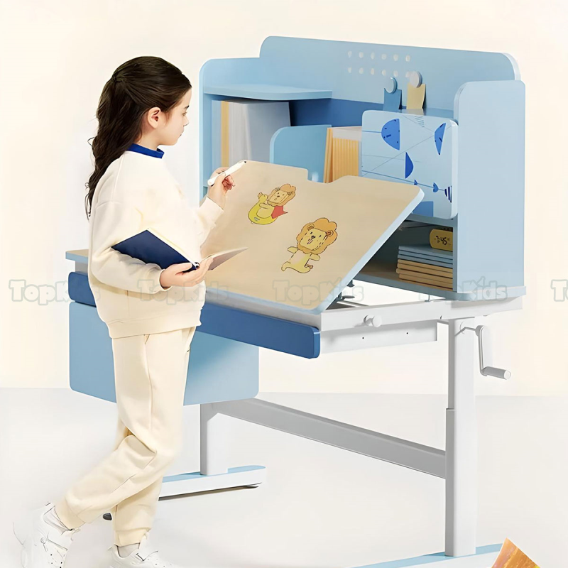 Bàn học có khả năng chỉnh độ cao đặc biệt là góc nghiêng phù hợp với hoạt động của bé như: học bài, đọc sách, vẽ tranh … Biên độ nâng được từ 0 đến 60 độ độ tạo góc nhìn hợp lý tránh tật cận thị. Mặt bàn được làm từ chất liệu chống lóa, chống xước, dễ dàng lau chùi kể cả khi viết lên mặt bàn giúp vệ sinh dễ dàng.