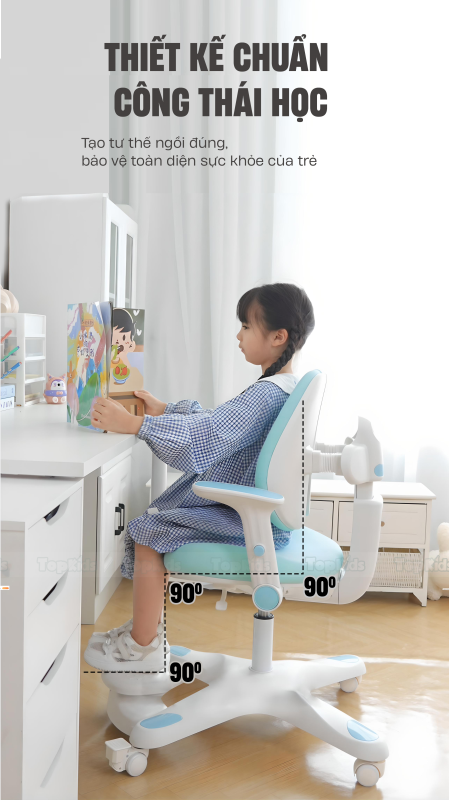 Ghế ngồi có thể nâng chiều cao theo độ tuổi nên phù hợp cho bé từ mẫu giáo cho đến trung học phổ thông (từ 3-18 tuổi với chiều cao trẻ lên đến 1,8m). Ghế có điểm tựa lưng ôm sát sẽ giúp bé không bị mỏi, đảm bảo cột sống luôn thẳng. Khoảng cách giữa mắt và bàn được căn chỉnh tối đa để bé có góc nhìn chuẩn giữ gìn đôi mắt sáng chống cận thị.